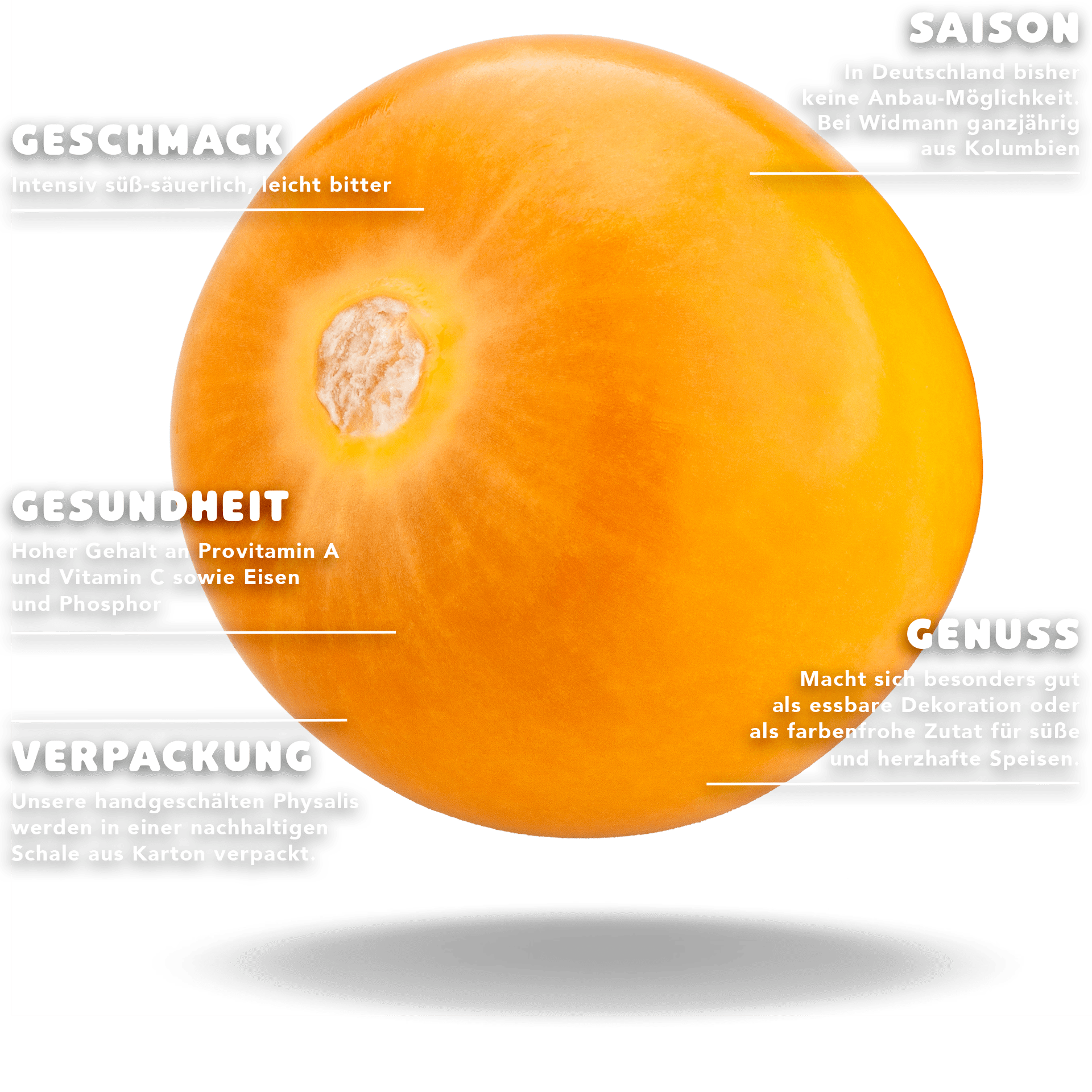 Da die Physalis wärmere Gegenden bevorzugt, kommt sie bei Widmann das ganze Jahr über aus Kolumbien. Die Früchte sind ziemlich empfindlich. Deshalb bringen wir sie auf schonendem Weg nach Deutschland und verpacken sie hier tagesfrisch. Eine Besonderheit bei uns: Wir bieten diese auch in liebevoll von Hand geschälter Form an. So erkennt man auf den ersten Blick, dass die Leuchtkugeln snackbereit sind. Angenehmer Nebeneffekt: Man spart viel Zeit bei der Zubereitung.